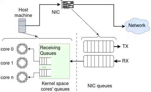 As shown by the figure beside, packets coming into the network interface card (NIC) are processed and loaded to the receiving queues managed by the cores (which are usually implemented as ring buffers within the kernel space). The main objective is being able to leverage all the cores available within the CPU to process incoming packets, while also improving performances like latency and throughput.[4][5][6]
