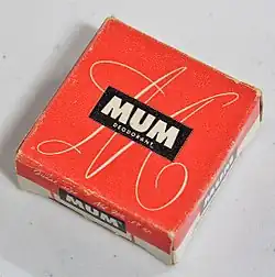 Mum was the first brand of commercial deodorant. Containing a zinc compound as its active ingredient, it was developed in Philadelphia in 1888.[1] According to the manufacturer's web-site, "The MUM brand owes its name to a nurse of the inventor, who was nicknamed "Mum".[2] Another source claims that the brand was named after the term "mum" from the phrase "Mum's the word", meaning to keep silent.[1] Mum was originally sold as a cream in a jar and applied with the fingertips. The small company was bought by Bristol-Myers in 1931.