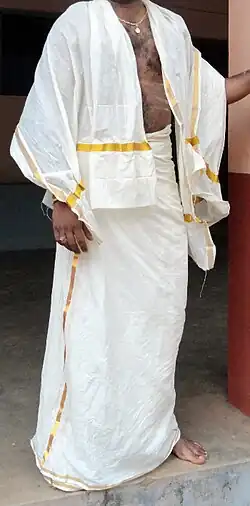 A mundu usually has a line of comparatively thicker cloth woven into it near the border called the kara. The kara can be coloured and comes in various sizes. There is also double coloured and ornamental kara (a strip of colour at the end of the mundu).[1] For more ceremonial occasions (like weddings), a mundu has a golden embroidery known as kasavu. The wearer highlights the 'kara' by carefully folding the end of the mundu. Unspoken rules of etiquette govern the way the mundu is worn. Men belonging to Islam should wear the mundu facing right side (kara facing right side) and Christian or Atheist men need to wear it kara facing in the middle.Mundu is compulsory in Hindu culture especially when Hindu men are entering into a Goddess Temple.Also Muslim men prefer to wear mundu with different colours of Kara while its a compulsion for Hindu men to wear mundu with golden kara