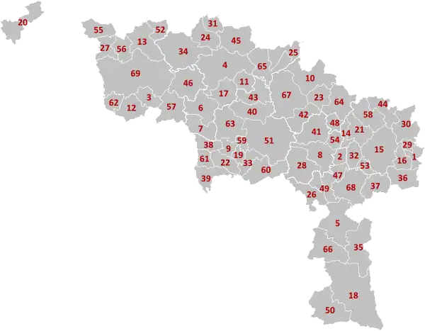 Wallonia is a region located in southern Belgium, and divided into 261 municipalities, listed in the table below. The numbers refer to the location of the municipalities on the maps of the respective provinces.