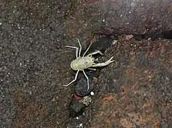 Munidopsis polymorpha is a species of squat lobster (also known as the blind albino cave crab, Jameos blind crab or jameito) that is endemic to Lanzarote, Canary Islands. They are small, blind and pale, and can be found in the caves of Jameos del Agua, in lava tubes formed by volcanic eruptions 15,000 - 13,000 years ago.[1] Ovigerous females carry only two eggs which are relatively big in contrast to the numerous small eggs in other anomuran crustaceans.[2] It is the animal symbol of the island of Lanzarote.[3]