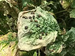 Harlequin bugs are phytophagous insects. Adults and nymphs feed on the stems and leaves of plants such as cabbage, broccoli, kale, turnip, radish, horseradish, mustard and rapeseed, and often cause blotching by their piercing-sucking feeding.[1] These plants are economically important and are abundant in crop fields but when they are not in production, harlequin bugs are able to feed on wild plants as well.[2]