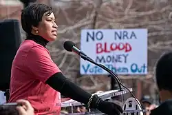 Bowser is a strong advocate of gun control, characterizing herself in her inaugural speech in January 2015 as "a mayor who hates guns".[120] Bowser has encouraged the D.C. Council to ban bump stocks, with the aim of highlighting the issue of gun control to congress. "Americans are demanding common-sense action, and as leaders, we must listen and act. Bump stocks, which turn already dangerous weapons into lethal machines, have no place in our society," said Mayor Bowser.[121][122] Bowser was also "unusually supportive" of the March for Our Lives rally in Washington, D.C. in March 2018, and in 2018 was said to be positioning herself as a national figure in the gun control movement.[123]