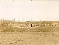 From at least 1875 through the first few games of 1895, the team staged its home games at Penn's multi-purpose athletic grounds, aka University Grounds.[8][9] The field was on the block southeast of the 37th and Spruce intersection, a few blocks west of the eventual site of Franklin Field.[10] That site is now occupied by dormitories and a quadrangle. When a fire destroyed the Philadelphia Phillies' home ballpark in August of 1894, the Phillies played some home games here.[11]