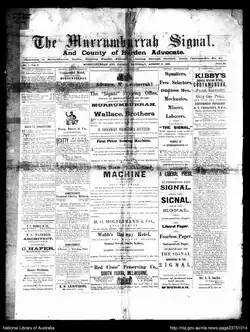 The Murrumburrah Signal and County of Harden Advocate was first published on 6 August 1881[3] by proprietors P. Jefferson Wallace and Robert Bruce Wallace.[1] Initially it was published every Saturday and circulated in Murrumburrah and the surrounding districts.[2] From 14 November 1946 the title changed to The Signal, Murrumburrah-Harden.[4] The paper ceased publication on 9 January 1947[1] when it was merged with the Harden Express to form The Harden-Murrumburrah Express.[5]