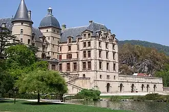 Located 15 km south of Grenoble on the Route Napoléon, the Château de Vizille (Castle Lesdiguières) is the former home of the Dukes of Lesdiguières. The founder of the dynasty, François de Bonne de Lesdiguières, completed his castle in 1619. King Louis XIII, who made him Constable of France, visited it on 3 December 1622. In 1716, the building was transferred to the Dukes of Villeroy. The Perier family owned it from 5 June 1780 to 23 December 1895.[2] The castle was the summer residence of the presidents of the French Republic from 1924 to 1972. France ceded the castle and its domain to the General Council of Isère, which was entrusted with giving it a prestigious cultural role, in 1973.