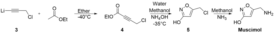 McCarry's synthesis is a three step synthesis involving a lithium acetylide produced from propargyl chloride. The acetylide (3), was dissolved in ether, cooled to -40 °C, and treated with excess ethyl chloroformate to afford ethyl 4-chlorotetrolate (4) in a 70% yield. (4) was then added to a solution of water, methanol and hydroxylamine at -35 °C. At a pH of between 8.5 and 9, the isoxazole (5) was recovered in a 41% yield. Muscimol was formed in a 65% yield when (5) was dissolved in a saturated solution of methanol and anhydrous ammonia and heated from 0 °C to 50 °C. The total yield was 18.7%.[50]