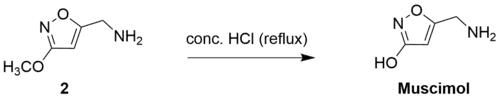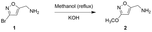 Muscimol was synthesized in 1965 by Gagneux,[47] who utilized a bromo-isoxazole starting material in a two step reaction. 3-bromo-5-aminomethyl-isoxazole (1) was refluxed in a mixture of methanol and potassium hydroxide for 30 hours, resulting in 3-methoxy-5-aminomethyl-isoxazole (2) with a yield of 60%.