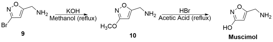 (9) was then refluxed with potassium hydroxide in methanol to generate 5-Aminomethyl-3-methoxyisoxazole (10) with a 66% yield. Subsequent reflux of (10) with hydrobromic acid and acetic acid generated muscimol with a yield of 62%. The overall synthetic yield was 30%.[43]