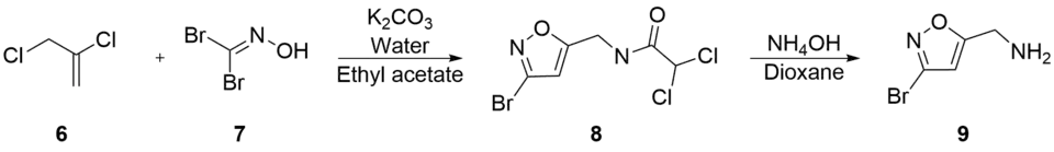 Varasi's synthesis is notable for its inexpensive starting materials and mild conditions. It begins with the combination of 2,3-Dichloro-1-propene (6), potassium bicarbonate, water, and dibromoformaldoxime (7) (which is a well known precursor of bromo nitriloxyde, a reactive dipole for regioselective Diels-Alder cycloadditions, which forms in alkali), all dissolved in ethyl acetate. 5-Chloromethyl-3-bromoisoxazole (8) was extracted with an experimental yield of 81%. 5-Aminomethyl-3-bromoisoxazole (9) was formed in 90% yield by the combination of (8) and ammonium hydroxide in dioxane.[43]