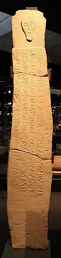 Among the artifacts exposed, there are three funerary stela with a paleosabellic inscription from Penna Sant'Andrea, aristocratic funeral beds of the cismontane Vestini people, a small bronze statue of Hercules Curinus from a sanctuary on the slopes of Mount Morrone, a monumental marble statue of Hercules from Alba Fucens, the Stele of Guardiagrele dated to the 7th century BC, the Torso of Rapino of the same age and the Lady of Capestrano, which is a headless female statue discovered along with the Warrior of Capestrano. The numismatic collection is composed by thousands of coins from the 4th century BC to the Italian unification, such as a rare golden coin bearing the face of Galba. The private collection, which was created by the lawyer and scholar Giovanni Pansa and donated in 1954, includes different bronze figures and other antiquities.[2][3]