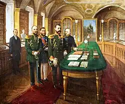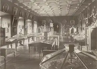 The museum was nationalized and the Provisional Archaeological Commission was disbanded. Museum library was turned into the Vilnius Public Library and the museum was attached to it. The main hall (the present-day Hall of Pranciškus Smuglevičius) was given to the library while the museum moved to the third floor.[12] The main hall was redecorated – painter Vasily Gryaznov replaced Neoclassicist murals of Smuglewicz's with Neo-Byzantine decor. Three ceiling paintings were removed and were lost; the Smuglewicz's interior was restored by Jerzy Hoppen in 1929.[13] The library was officially opened on 24 May 1867 in a ceremony attended by Tsar Alexander II.[14] The new museum served to support and promote the official Russification policies. It now included a number of Slavic items, for example portraits of Russian officials or items related to the Eastern Orthodox Church.[1] The reorganized museum lost the support from local population; the museum continued to receive contributions but those were mostly coins or small items.[1] The museum was visited mostly by schoolchildren and soldiers during mandatory trips.[2] It was visited by 9,514 people in 1905 and by 12,180 people in 1907.[14] Interest in collecting items related to Polish–Lithuanian history did not diminish; instead, it became a form of passive resistance and an expression national pride.[1] Some institutions, such as Ossolineum in Wrocław or Polish Museum in Rapperswil, were established outside of the Russian Empire. As these new cultural centers were far outside of Lithuania, it contributed to Vilnius losing its leading role in Polish–Lithuanian cultural life.[1]