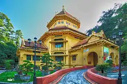 The museum is housed in a colonial French building which is a cupola shaped edifice in the shape of a pagoda. The design of the building is an amalgamation of French and Chinese architecture known as Indochina architecture.[1][6][4] The building designed by Hebrard, incorporates double walls and balconies for a natural ventilation system and protection from sunshine.[4] The exhibition area is more than 2,200 square metres (24,000 sq ft) with exhibits arranged chronologically.[2] It is divided into five major sections: Section 1 covers period from the prehistoric period from the Stone Age (30,000–40,000 years ) to 4,000–5,000 years ago; Section 2 has displays from the time of nation building during the Tran dynasty; Section 3 has exhibits from the period of the Ho dynasty to the August 1945 Revolution; and Section 4 has artifacts of the Champa stone sculptures.[7] The museum showcases Vietnam's history with very large collection of about 200,000 items, covering the Neolithic age, Bronze Age, Sa Huỳnh, Oc Eo, and Hung periods, Nguyễn dynasty, Cham period, and also northern Vietnam's Đông Sơn, a culture which existed about 1000 BC-100 AD.[8][6] These exhibits are in the main building. The exhibits highlight communism and depict the rule of the French colonists as cruel.[8]