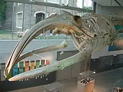 North Atlantic Right Whale #2030 was killed after becoming severely entangled in fishing gear in May 1999. Rescuers attempted to free her, but she fought them off, swimming hundreds of miles before ultimately succumbing to her injuries.[7] Director Warren D. Allmon expressed interest in acquiring the skeleton after being notified on October 21, 1999 by the National Marine Fisheries Service that the 44-foot (13 m) right whale had been spotted dead off the coast of Cape May, New Jersey.[4]: 92 PRI was informed that they could take the skeleton if they assisted with flensing the 30-ton carcass. Three days later, the bones arrived at PRI,[8] where they were buried in a bed of horse manure for several months in order to remove the remaining flesh and oil. After cleaning, North Atlantic Right Whale #2030 was mounted on a steel armature in a greenhouse on-site. The museum building was left open on the northeast end so that the whale could be brought through for installation. In November 2002, the skeleton was transported into the building via crane and mounted in the atrium lobby.[9]