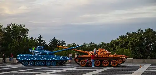 One of the museums also displays the armaments used by the Soviet army post World War II. The sculptures in the alley depict the defence of the Soviet borders from the 1941 German invasion, the Nazi occupation, partisan struggle, devoted work on the home front, and the 1943 Battle of the Dnieper.