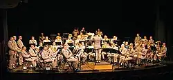 The wind formation in concert configuration consists of 32 Musicians with Clarinets, Saxophones, Trumpets, Cornets, French horns, Trombones, Double basses, Baritone horns, and Sousaphones.[2] In marching band configuration, the 32 musicians are organized into:
