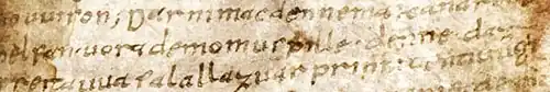 In 1832 the first editor, Johann Andreas Schmeller, proposed as the poem's provisional title what seemed to be a key word in line 57: dar nimac denne mak andremo helfan uora demo muspille ('there no kinsman is able to help another before the muspilli).[h] This is the only known occurrence of this word in Old High German.[14] Its immediate context is the destruction of the world by fire, but it is unclear whether the word denotes a person or some other entity. Distinctively, Kolb[8](pp 5 ff, 32) took uora as a local preposition ('in front of'), with muspilli signifying the Last Judgment itself, or perhaps its location or its presiding Judge.[16]