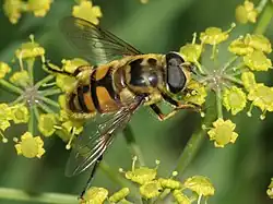 Myathropa florea, sometimes referred to as the Batman hoverfly,[2][3][4] is a very common European and North African species of hoverfly. Adults may be seen on flowers from May to September. It is of a similar size to the common drone fly (Eristalis tenax), but Myathropa are generally more yellow, with two light bands to the thorax, interrupted with a black central smudge. In museum specimens, any yellow colour soon fades to brown after death. Like most species in the tribe Eristalini, Myathropa are rather variable in size, shape and colour.