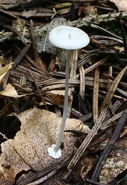 The cap is white and small, with a diameter typically ranging from 2.5 to 7.5 mm (0.1 to 0.3 in). Initially convex to cucullate (hood-shaped), it flattens during maturity, developing visible surface grooves that correspond to the gills underneath the cap; the surface may also be covered with glistening particles, remnants of the partial veil.[16] The cap is pallid gray with a whitish margin when young, but soon becomes white overall. The flesh is membranous, fragile, and thin (less than 0.5 mm). The gills are free from attachment or narrowly attached (adnexed) to the stem.[17] They are up to 0.5 mm broad, distantly-spaced (usually numbering between 7 and 12), and sometimes adhering to each other to form a slight collar (a pseudocollarium) around the stem. They are translucent-white throughout their development, with a fringed, white edge.[18] The hollow stem is 0.5 to 2 cm (0.2 to 0.8 in) long, and usually curved and threadlike. The bottom of the stem is enlarged into a slight bulb, which is initially nearly spherical.[17] At the very base of the stem is a small, white, and hairy disk-like base that attaches to the substrate.[19] The edibility of the mushroom is unknown, but like many small Mycenas, they are insubstantial and not likely to be considered for the table.[20]