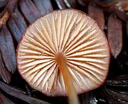 The gills are adnate or slightly toothed, and well-spaced. They are narrow to moderately broad, sordid reddish to grayish, with even edges that are dark reddish brown. The stipe is 2–6 cm (0.8–2.4 in) long, 1–1.5 mm thick, equal in width throughout, and fragile. The base of the stipe is covered with coarse, stiff white hairs, while the remainder is covered with a drab powder that soon sloughs off to leave the stipe polished, and more or less the same color as the cap. It also exudes a bright or dull-red juice when cut or broken.[9] The edibility of the mushroom is unknown—but it is considered too insubstantial to be of culinary interest.[5][6]