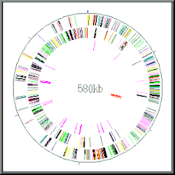 The genome of M. genitalium strain G37T consists in one circular DNA molecule of 580,070 base pairs.[24] Scott N. Peterson and his team at the University of North Carolina at Chapel Hill reported the first genetic map using pulsed-field gel electrophoresis in 1991.[25] They performed an initial study of the genome using sequencing in 1993, by which they found 100,993 nucleotides and 390 protein-coding genes.[26] Collaborating with researchers at The Institute for Genomic Research (TIGR; now the J. Craig Venter Institute), which included Craig Venter, they completed the genome sequence in 1995 using shotgun sequencing.[24] Only 470 predicted coding regions were identified in 1995, including genes required for DNA replication, transcription and translation, DNA repair, cellular transport, and energy metabolism. It was the second complete bacterial genome ever sequenced, after Haemophilus influenzae.[24] Later data from KEGG reports 476 protein-coding genes and 43 RNA genes, totaling 519.[27] It is unclear where the "525" gene count for the G37T stems from and what gene calling procedure was used.[28] The current genome annotation in the Uniprot reference proteome lists 483 proteins.[29]