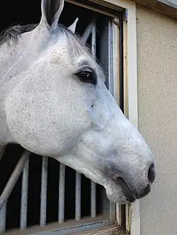 Mylord Carthago is a gray Selle Français stallion. He stands 1.71 m tall. According to Leprévost, he's a horse who gives a lot to his rider, and wants to get ahead.[20] He is energetic, and has great style over jumps. He's also a very sensitive animal. The rider insists on his "kindness" and the quality of his mind, testifying that he has never refused to jump a fence, even in training. According to her, he is gifted with excellent learning faculties, an intelligence that is also evident in his dual career as a competitor and breeder.[21]