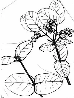 This species can take the form of a shrub 3 or 4 meters tall or a tree up to 9 meters tall. New twigs are coated in reddish brown hairs, and older branches are bare and gray. The leaves are up to 7.5 centimeters long by 5 wide. New leaves are shiny and coppery in color. Hairy flowers grow in clusters.[3]