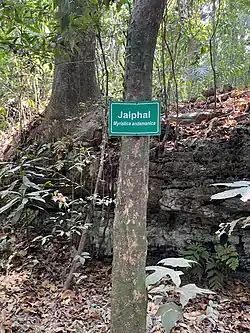 Myristica andamanica is a species of plant in the family Myristicaceae. It is endemic to the Andaman and Nicobar Islands. Recent studies by Waman and Bohra (2020) suggested that the seeds can regenerate on their own if they remain undisturbed in soil and favourable microclimatic conditions are available. However, to ensure regular production of seedlings, assisted regeneration was recommended. Retention of seed hull and use of sinking seeds gives high germination percentage. Soaking of seeds in water for 24 h prior to sowing improved germination.