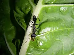 Despite their ferocity, adults are nectarivores, consuming honeydew (a sweet, sticky liquid found on leaves, deposited from various insects), nectar, and other sweet substances.[109][110] The larvae, however, are carnivorous. After they reach a certain size, they are fed insects that foragers capture and kill.[133] The workers also regurgitate food for other ants to consume.[134] Young ants are rarely fed food regurgitated by adults.[135] Adult workers prey on a variety of insects and arthropods, such as beetles, caterpillars, earwigs, Ithone fusca, Perga sawflies, and spiders.[116][136][137][138] Other prey include invertebrates such as bees, cockroaches, crickets, wasps and other ants; in particular, workers prey on Orthocrema ants (a subgenus of Crematogaster) and Camponotus, although this is risky since these ants are able to call for help through chemical signals.[136][139][140][141] Slaters, earthworms, scale insects, frogs, lizards, grass seeds, possum feces and kangaroo feces are also collected as food.[142][143] Flies such as the housefly and blowfly are consumed. Some species, such as M. pilosula, will only attack small fly species and ignore larger ones.[90][144] Nests of the social spider Delena cancerides are often invaded by M. pyriformis ants, and nests once housing these spiders are filled with debris such as twigs and leaves by the workers, rendering them useless.[145] These "scorched earth" tactics prevent the spiders competing with the ants.[146] M. gulosa attacks Christmas beetles, but workers later bury them.[147]