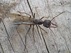 Queens are usually larger than the workers, but are similar in colour and body shape.[84][83] The head, node, and postpetiole are broader in the queen, and the mandibles are shorter and also broad.[85] Myrmecia queens are unique in that particular species either have fully winged queens, queens with poorly developed wings, or queens without any wings. For example, M. aberrans and M. esuriens queens are ergatoid, meaning that they are wingless.[86] Completely excavated nests showed no evidence of any winged queen residing within them.[87] Some species have queens which are subapterous,[87] meaning they are either wingless or only have rudiments of wings; the queens can be well developed with or without these wing buds.[88] M. nigrocincta and M. tarsata are "brachypterous", where queens have small and rudimentary wings which render the queen flightless.[6][89] Dealated queens with developed wings and thoraces are considered rare. In some species, such as M. brevinoda and M. pilosula, three forms of queens exist, with the dealated queens being the most recognisable.[87]