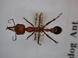 Worker ants have been known to measure 3.7 cm (1.5 in) in total length, while queens can exceed 4.0 cm (1.6 in) in length, making them one of the largest types of bull ants in Australia and in the world. Most of their bodies are dark red, with the exception of the bulbous parts of their abdomens being black.[2]