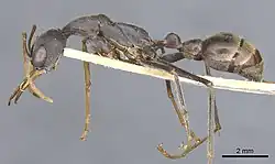 Average length for a typical worker ant is 11-13 millimetres long. It is mainly a blackish-brown colour. Mandibles, tarsi, and other features are yellow, scapes and anterior and several other features is a yellowish brown. Head and thorax is blackish-brown.[2][3]