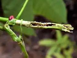 In facultative mutualism, the survival of the parties (plant and ants, in this instance) does not depend upon the interaction. Facultative mutualisms most often occur in plants that have extrafloral nectaries but no other specialized structures for the ants.[3] These non-exclusive nectaries allow a variety of animal species to interact with the plant.[3] Facultative relationships can also develop between non-native plant and ant species, where co-evolution has not occurred. For example, Old World legumes that were introduced to North America can be protected by ants that originated from the plants' regions of origin.[3]