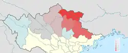 During the early Song dynasty, the Huang clan was left in charge of the You and Zuo rivers.[12] The Wei had settled on the Song-Viet border.[13] However the power of the Nong clan increased and began to upset Huang supremacy. By the early Song, they ruled over an area known as Temo, which stretched from modern Wenshan Zhuang and Miao Autonomous Prefecture in the west to Jingxi in the east and Guangyuanzhou (Quảng Nguyên, now Cao Bằng province[14]) in the south.[15] Emperor Taizong of Song (r. 976-997) bestowed special favors on Nong leadership, acknowledging that they had succeeded the Huang in the Zuo River region.[16]