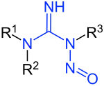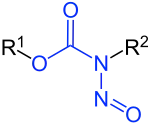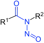 Nitrosamides are chemical compounds that contain the chemical structure R1C(=X)N(–R2)–N=O, that is, a nitroso group bonded to the nitrogen of an amide or similar functional group.[1] Specific classes include the N-nitrosamides, N-nitrosoureas, N-nitrosoguanidines, and N-nitrosocarbamates. Nitrosamides are usually chemically reactive, metabolically unstable,[1] and often carcinogenic; however, in contrast to the N-nitrosamines, N-nitrosamides are not generally contaminants found in food.[1]