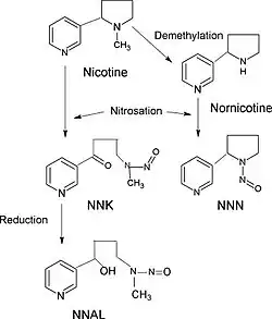 NNN is found in a variety of tobacco products including smokeless tobacco like chewing tobacco and snuff,[3] cigarettes, and cigars. It is present in smoke from cigars and cigarettes, in the saliva of people who chew betel quid with tobacco, and in the saliva of oral-snuff and e-cigarette[4] users. NNN is produced by the nitrosation of nornicotine during the curing, aging, processing, and smoking of tobacco.[5] Roughly half of the NNN originates in the unburnt tobacco, with the remainder being formed during burning.