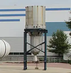 In August 1961, the Soviet Union ended the nuclear test moratorium that had been in place since November 1958, so Kennedy resumed US nuclear weapons testing in September.[71] With a second crash program at the Nevada Test site, labor became scarce, and there was a strike. When that ended, the workers had to come to grips with the difficulties of dealing with hydrogen, which could leak through microscopic holes that were too small for other fluids to pass through. On 7 November 1961, a minor accident caused a violent hydrogen release. The complex finally became operational in 1964. SNPO envisaged the construction of a 20,000 MW nuclear rocket engine, so Boyer had the Chicago Bridge & Iron Company construct two gigantic 1,900,000-litre (500,000 US gal) cryogenic storage dewars. An engine maintenance and disassembly building (E-MAD) was added. It had thick concrete walls and shield bays where engines could be assembled and disassembled. There was also an engine test stand (ETS-1); two more were planned.[67]