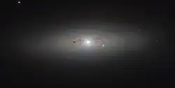 This is a type of active galaxy known as a LINER, which means that it shows emission lines of ionized gas in the region of its nucleus. Chemically, the stars at the center of the nucleus have a higher metallicity than in the neighboring regions. It appears that there is a tilted disk of stars orbiting the nucleus within a radius of 820 ly (250 pc). The galactic bulge itself appears triaxial with the ionized gas concentrated near the center of this bulge region.[10] Images of the galaxy with the Hubble Space Telescope show a wispy disk of dust on all sides of the nucleus, with what appears to be the tendrilous remains of an ionization cone leading away 4 arc seconds to the northeast. Such features are common in Seyfert galaxies.[9]