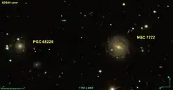 NGC 7222 has a companion which is a spiral galaxy, PGC 68229, also known as CGCG 377-036.[11] The galaxy is located west of NGC 7222 at close proximity and is 579 million light-years distant.[12] It is possible both galaxies together make up a galactic pair.[4]