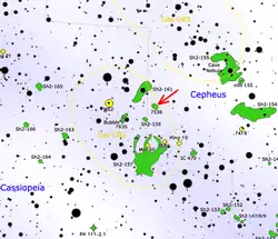 NGC 7538, near the more famous Bubble Nebula, is located in the constellation Cepheus. It is located about 9,100 light-years from Earth. It is home to the biggest yet discovered protostar which is about 300 times the size of the Solar System.[4] It is located in the Perseus Arm of the Milky Way and is probably part of the Cassiopeia OB2 complex.[3] It is a region of active star formation including several luminous near-IR and far-IR sources.[3] Stars in NGC 7538 are mainly low-mass pre-main-sequence stars.[5]