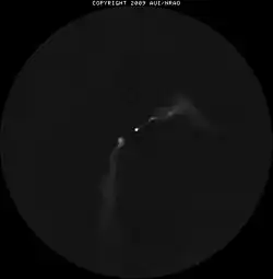 The northwest jet is the main one and forms a distorted plume about 5 arcminutes long, with a hotspot about 30 arcseconds from the core. The southeastern jet has a bright spot about 30 arcseconds from the core and then fans to a distorted plume that extends for 5 arcminutes.[6][5] In large scales the jets appear bend, maybe due to ram pressure as the galaxy moves through the intracluster medium.[7]