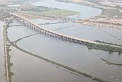 When construction finally got to Newark, there was the new challenge of deciding to build either over or under the Pulaski Skyway. If construction went above the skyway, the costs would be much higher. If they went under, the costs would be lower, but the roadway would be very close to the Passaic River, making it harder for ships to pass through. The turnpike was ultimately built to pass under.[42][43] As part of a 2005 seismic retrofit project, the NJTA lowered its roadway to increase vertical clearance and allow for full-width shoulders, which had been constrained by the location of the skyway supports.[44] Engineers replaced the bearings and lowered the bridge by four feet (1.2 m), without shutting down traffic. The work was carried out by Koch Skanska in 2004, under a $35 million contract (equivalent to $54.1 million in 2023[45]). The project's engineers were from a joint venture of Dewberry Goodkind Inc. and HNTB Corp. Temporary towers supported the bridge while bearings were removed from the 150 piers and the concrete replaced on the pier tops. The lowering process for an 800-foot (240 m) section of the bridge was done over 56 increments, during five weeks of work.[46]