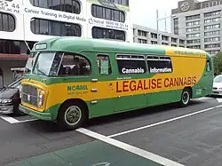 "Mary Jane the Cannabus" is a Bedford bus belonging to NORML New Zealand that serves as a mobile cannabis law reform activism centre.[3] Mary Jane is driven by Dakta Green and resides at The Daktory when not on the road. Mary Jane participated in a nationwide tour of New Zealand promoting cannabis law reform from March to May 2008.[4]