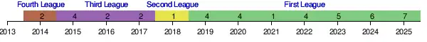 2013–14[15] 1. MNL (level 4) 2nd 15–7–4 did not qualify