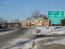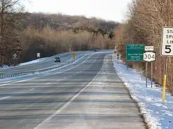 New York State Route 304 (NY 304), also known as "Rockland County Clerk Paul Piperato Memorial Highway",[3] as well as Pearl Street for its first half a mile and Main Street for other parts, is a north–south state highway located in central Rockland County, New York, in the United States. The 10.38-mile (16.70 km) route begins at the New Jersey–New York border in Pearl River and ends at an intersection with U.S. Route 9W (US 9W) in the community of Congers. The route is a main route through Rockland County, intersecting NY 59 and indirectly connecting to the New York State Thruway and the Palisades Interstate Parkway (PIP) in Nanuet. NY 304 has three distinct sections: a freeway that extends from Pearl River to Nanuet, a surface section between Nanuet and New City, and an expressway linking New City to Haverstraw.