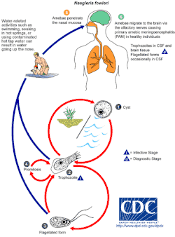 - ^ Yoder, J. S.; Straif-Bourgeois, S.; Roy, S. L.; Moore, T. A.; Visvesvara, G. S.; Ratard, R. C.; Hill, V. R.; Wilson, J. D.; Linscott, A. J.; Crager, R.; Kozak, N. A.; Sriram, R.; Narayanan, J.; Mull, B.; Kahler, A. M.; Schneeberger, C.; da Silva, A. J.; Poudel, M.; Baumgarten, K. L.; Xiao, L.; Beach, M. J. (2012). "Primary Amebic Meningoencephalitis Deaths Associated With Sinus Irrigation Using Contaminated Tap Water". Clinical Infectious Diseases. 55 (9): e79 – e85. doi:10.1093/cid/cis626. PMC 11307261. PMID 22919000.