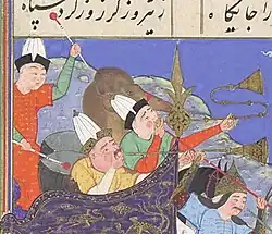 The Fatimids maintained huge representative orchestras with trumpet players and drummers. The Fatimid Caliph al-ʿAzīz (r. 975–996) invaded Syria from Egypt in 978 with 500 musicians blowing bugles (abwāq or būqāt, singular būq).[27] In 1171 Saladin resigned the successor of the last Fatimid caliph. During his time as Sultan of Egypt (until 1193), the historian Ibn at-Tuwair († 1120) wrote about the parade of a representative Fatimid orchestra at the end of the 11th century, which included trumpeters and 20 drummers on mules. Each drummer played three double-headed cylinder drums (t'ubūl ) mounted on the animals' backs, while the musicians marched in pairs.[28] The musical instruments of these orchestras are listed by the Persian poet Nāsir-i Chusrau (1004 – after 1072): trumpet būq (according to Henry George Farmer, a twisted trumpet, clairon), double - piped ball instrument surnā, drum tabl, tubular drum duhul (in India dhol ), kettledrum kūs, and cymbals kāsa.[27] According to the Arab historian Ibn Chaldūn (1332–1406), the musical instruments mentioned were still unknown in early Islamic times. Instead, the square frame drum duff and the reed instrument mizmar (zamr) were used in military. During the rule of the Abbasids (750–1258) larger military orchestras were introduced, which also had ceremonial functions and performed alongside surna and tabl contained the long metal trumpet būq an-nafīr, the kettle drum dabdāb, the flat kettle drum qas'a and the cymbals sunūj (singular sindsch).[29] Arabic authors in the late Abbasid period distinguished brass instruments between the coiled trumpet būq and the straight nafīr. The woodwind instruments of the time included the reed instrument mizmar, the doubled reed instrument zummara, the cone oboe surnā, the longitudinal flutes made of reed (ney and shababa) as well as the fission flute qasaba.[30]