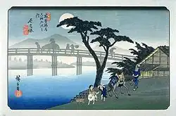 Hiroshige's print of Nagakubo-shuku, part of The Sixty-nine Stations of the Kiso Kaidō series. The title of this print is "Man on Horseback Crossing a Bridge." It is the Wada Bridge across the Yoda River.