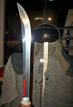 A naginata consists of a wooden or metal pole with a curved single-edged blade on the end; it is similar to the Chinese guan dao[4] or the European glaive.[5] Similar to the katana, naginata often have a round handguard (tsuba) between the blade and shaft, when mounted in a koshirae (furniture). The 30 to 60 cm (12 to 23.5 in) naginata blade is forged in the same manner as traditional Japanese swords. The blade has a long tang (nakago) which is inserted in the shaft.