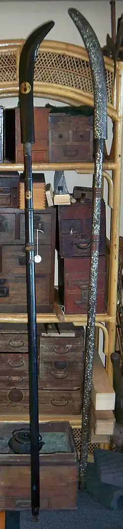 The naginata (なぎなた, 薙刀, lit. 'mowing sword') is a polearm and one of several varieties of traditionally made Japanese blades (nihontō).[1][2] Naginata were originally used by the samurai class of feudal Japan, as well as by ashigaru (foot soldiers) and sōhei (warrior monks).[3] The naginata is the iconic weapon of the onna-musha, a type of female warrior belonging to the Japanese nobility. A common misconception is that the Naginata is a type of sword, rather than a polearm.